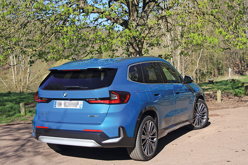 De profil, le SUV est caractérisé par ses flancs sculptés et sa ligne de toit allongeant sa silhouette. L’arrière du iX1 présente des lignes horizontales comparables à ses grands frères avec des passages de roues évasés.